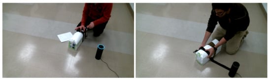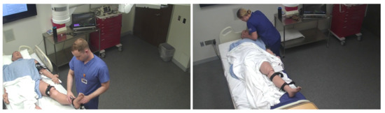 Once the VBSA is developed, it has been tested on a MARCHE protocol scenario, “massive hemorrhage,” in which a patient who is badly wounded with heavy bleeding and needs immediate medical attention by an ECP is treated using a VBSA to stop bleeding. Though VBSA cannot replace a trainer, it enhances the training by providing a sequence of steps to be followed during treatment. A leg manikin model is considered as the patient is treated using an Amazon Echo device that acts as the VBSA interface, as shown in Figure 6. Here, the trainer follows the series of actions step-wise, assisted by the Amazon Echo, and helps the patient stop bleeding. This experiment has been conducted using multiple categories of participants, and the data is collected and analyzed based on the survey that is conducted on the participants. Ref. [8] provides a detailed explanation of this experiment including data analysis and results.