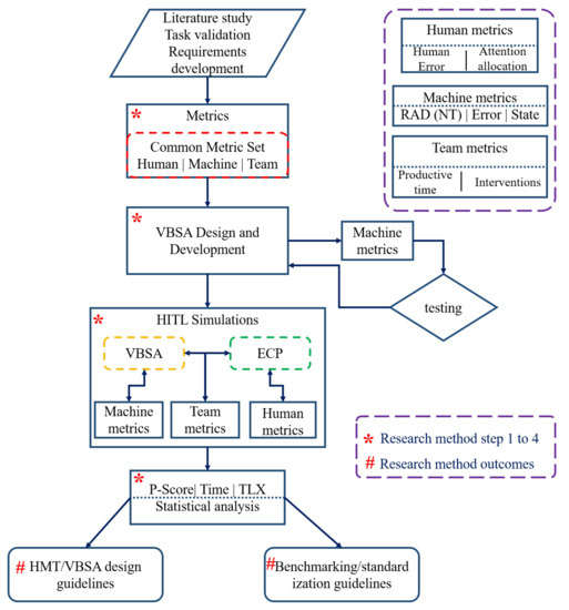 Over the past few years, continuous research efforts on human–machine partnering and related methodologies have brought the HMT concept from functional design to reality. The potential benefits of HMT could be limitless and could prompt a new industries in the 21st century. Recently, it has started gaining the recognition it deserves with its multidisciplinary applications. However, HMT is a complex subject and requires rigorous case studies in a controlled environment before its use. Human factor studies are a critical variable of interest in HMT. There is a significant technical advance achieved in autonomous systems (i.e., the machines) through AI, but that is not enough to fully realize an HMT. It requires a different approach to synergize both human and machine performance. In such cases, human performance is a subject of a mental model, task complexity, environment, and interface efficacy, thereby requiring careful assessment. Effective feedback methods are needed that are embedded in every stage of HMT building and operation. This can be achieved by metrics that evaluate an HMT’s effectiveness and its agents (e.g., human, machine, and team) on different levels. To this end, we propose several research questions and associated objectives of this study. Figure 1 presents proposed human-in-loop (HIL) simulation forhuman–machine teaming (HMT) standardization.