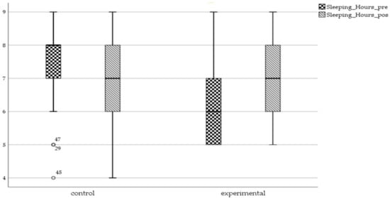 Box whisker graphic of sleeping hours in control and experimental groups in pre- and post-treatment phases.