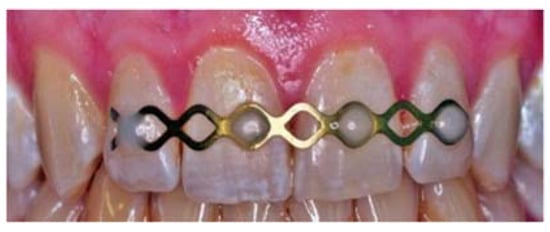 - Oikarinen, K. Comparison of the flexibility of various splinting methods for tooth fixation. Int. J. Oral Maxillofac. Surg. 1988, 17, 125–127. [Google Scholar] [CrossRef]