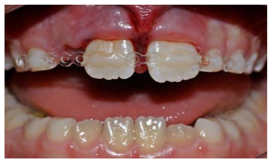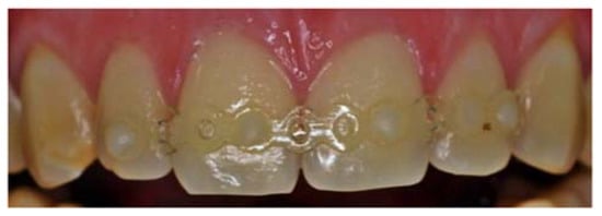 On the basis of the assessment of the power chain splint conducted in both studies, the one done in a laboratory situation [18] and ours, we can conclude that the power chain is a good alternative for injured teeth splinting. Application of the power chain benefits both the patient and the dentist. With its characteristics, such as stiffness, good esthetics, or low price, it was compared to a monofilament nylon fishing line [18]. However, due to its small diameter, the application of a nylon splint can sometimes be problematic. According to these authors, a splinting technique with monofilament nylon line cannot be used in case of the presence of edentulous spaces [27]. We had some doubts as to whether the power chain is suitable for using in such situations. However, applying it clinically in injured patients with some missing teeth has resulted in good treatment effects so far (Figure 8). However, further research on this aspect is needed.