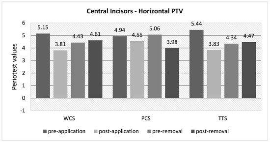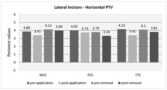 A significant decrease in lateral mobility of central incisors was observed after the application of the WCS and the TTS. However, based on the results of the physiological Periotest values (PTV) obtained for central incisors in individuals in a very similar age group [30] to this in our study, we could assume that PTV values recorded for central incisors after splinting with both materials were within the limits of physiological mobility. With a significantly marked decrease in the horizontal mobility of the central incisors and only slight changes in vertical mobility of these teeth following splinting, we revealed similar findings to those presented in the previous studies [5,8]. Such results indicated that splinting materials ensure adequate lateral teeth stabilization, while allowing for vertical physiological mobility.