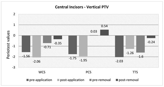 For all three treatment methods vertical tooth mobility increased before (PTV pre-removal) and after (PTV post-removal) splints removal compared to baseline mobility (PTV pre-application). No significant differences were observed across evaluated splinting methods.