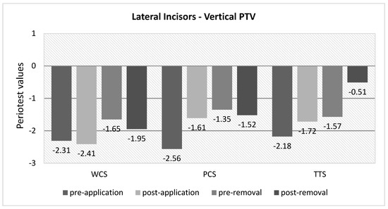 Comparing PTV pre- and post-application, the reduction of lateral tooth mobility was significantly pronounced only for the WCS (p = 0.013).