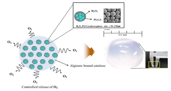 For this reason, our group assessed whether hydrogen peroxide could be used as a source of oxygen and has successfully demonstrated that it is possible to encapsulate hydrogen peroxide (H2O2), a small water molecule, in a biocompatible single polymer shell [17,18,19,20,21]. In brief, we used a dual emulsion solvent evaporation method to encapsulate hydrophilic low molecular weight drugs (such as hydrogen peroxide) in PLGA microspheres and tested these microspheres in vitro in a 3D alginate matrix. In order for the hydrogen peroxide to decompose of only oxygen and water, catalase was immobilized to alginate by binding the -NH2 group of catalase to the -COOH group of alginate by EDC(N-(3-Dimethylaminopropyl)-N′-ethylcarbodiimide hydrochloride)/NHS (N-Hydroxysuccinimide) chemistry [22,23]. According to previous studies, cell survival was 60–65% in hypoxic conditions of 1% O2, but the rate increased up to 100% when oxygen-producing microspheres were added in the same conditions [15,16]. Thus, it was confirmed that oxygen was released in stable condition from polymeric matrix and supported cell survival in hypoxic condition and ultimately resulted in successful tissue regeneration (Figure 1).