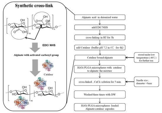 In this study, we confirmed the efficacy and safety of the newly developed oxygen-releasing polymeric system fabricated by the microencapsulation process of a double emulsion solvent evaporation [25,26,27]. For optimally safe and efficient release of oxygen from a well-known oxidant H2O2, catalase immobilization onto alginate backbone was employed using EDC/NHS chemistry. Consequently, there is direct contact between H2O2 and cellular tissues, in which harmful and toxic cellular entities can be reduced, as the H2O2 is safely decomposed into water and oxygen in the presence of catalase.