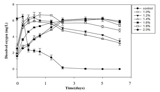 Lower concentrations of alginate showed a higher release rate at the start of the experiment, but the oxygen release dropped after 7 days (Figure 4). This is likely due to the high porosity of the low concentration alginate. Conversely, increasing the concentration of alginate enabled the production of a more tightly packed coating, resulting in slower diffusion of hydrogen peroxide and prolonged oxygen release. In conclusion, the optimal alginate coating criterion was evaluated as 1.6% (w/w).