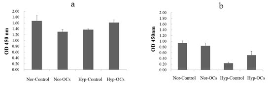 Human umbilical vein endothelial cell (HUVEC) proliferation assay was performed using cell counting kit-8 (CCK-8) for hypoxia condition (n = 3); after 3 days (a) and after 7 days (b). Nor: normoxia condition (5% O2), Hyp: hypoxia condition (1% O2)