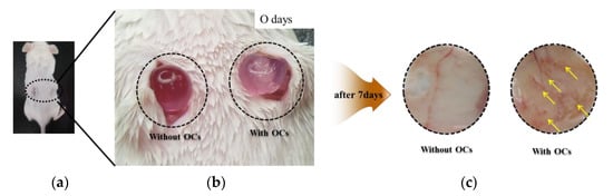 The present study followed the ethics criteria of the Institutional Animal Care and Use Committee at Kyungpook National University Hospital (KNUH 2018-08-008-003). Male Jcl:ICR mouse (4 weeks of age) were given an intramuscular injection of ketamine hydrochloride (100 mg/kg, Yuhan Corporation, Seoul, Korea) and xylazine (10 mg/kg, Bayer Korea, Seoul, Korea) for anesthesia. The epidermis, with a diameter of 5.0 mm × 5.0 mm, made incisions at two places on each side of the back. There were two groups of samples: group 1 was transplanted without OCs, and group 2 was transplanted with Ocs. The top part of the skin was sutured with a blue nylon (3/0) to mark planted spots and fix capsules; at day 7, samples were retrieved for assessment.