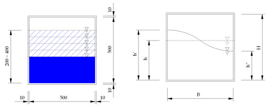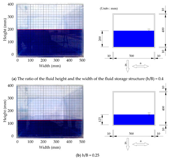 The h/B was set at 200, 250, 300, 350, and 400 mm (h/B: 0.4, 0.5, 0.6, 0.7, and 0.8) in order to estimate the dynamic characteristics of the fluid surface according to the ratio of the width of the fluid storage structure to the initial fluid height. The specifics of the structure applied to the analysis are shown in Figure 9, and the analysis was performed by applying the seismic load shown in Figure 6a.