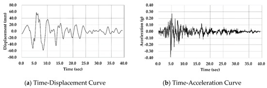 In order to verify the similarity between the fluid–structure interaction analysis applying the SPH method and the scaled model test, an acrylic tank was constructed with the shape and specifications shown in Figure 1. The dimensions of the tank were 500 (width), 400 (height), and 10 (thickness), and the heights of the fluid inside the tank were 125 and 200 mm, which were 25% and 40% of the width of the tank, respectively. The shaking table used in the test loaded the seismic load on to the scaled model through displacement control. The shaking table experiment was performed using the time-displacement of the real earthquake shown in Figure 2a, and the time-acceleration acting on the scaled model was measured using an accelerometer attached to the bottom of the shaking table. The measured time-acceleration curve is shown in Figure 2b.