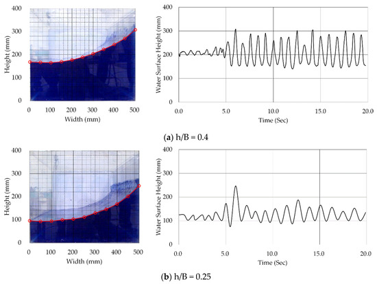 When the same seismic load was applied, as the ratio of the width of the fluid storage structure and the height of the internal fluid changes, the maximum sloshing height, free-water surface shape, and time-sloshing height of the fluid were experimentally confirmed, and the results are shown in Figure 3 and Table 1. When the ratio of the fluid height and the width of the fluid storage structure (h/B) was 0.4, the time for the maximum sloshing height to occur was 6.000 s, and the measured maximum and minimum sloshing heights of the fluid were 308.0 and 168.0 mm. Considering the initial fluid height of 200 mm, the maximum fluid height rose to 154% of the initial fluid height, and the minimum height fell to 84% of the initial fluid height. In addition, when h/B was 0.25, the time for the maximum sloshing height to occur was 6.020 s, and the maximum and the minimum sloshing heights of the fluid generated at this time were measured as 247.0 and 95.0 mm. Considering the initial fluid height of 125 mm, the maximum sway height of the fluid rose to 198% and the minimum sway height fell to 76%. From these experimental results, it can be seen that as h/B increases, the maximum and the minimum sloshing heights of the fluid tend to decrease.