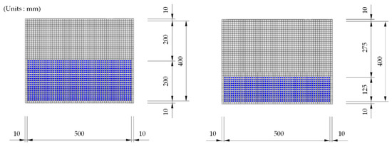 The element and material characteristics of the numerical analysis model applied to the fluid–structure interaction were the same as the model applied to the verification analysis. The shape, specification, and height of the fluid are as shown in Figure 7.