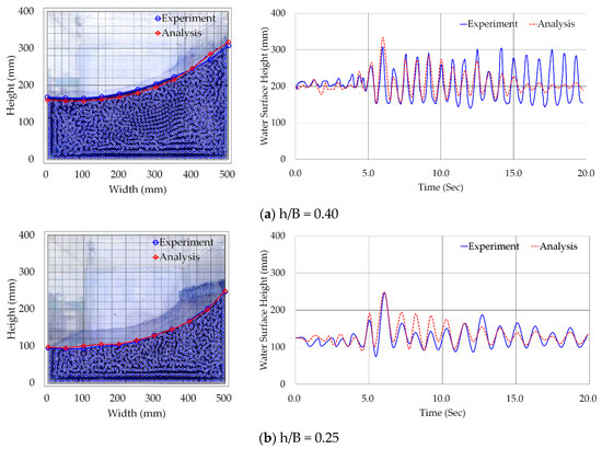 The maximum and minimum sloshing height and occurrence time of the fluid water surface obtained from the experiment and analysis are compared and shown in Figure 5 and Table 3. When the ratio of the fluid height and the width of the fluid storage structure (h/B) was 0.40, the time for the maximum sloshing height to occur was 6.000 s in the experiment and 6.020 s wan the analysis. It was confirmed that the maximum sloshing height by the experiment and analysis occurred at almost the same time. When h/B was 0.25, the time for the maximum sloshing height to occur was 6.020 s in the experiment and analysis. When h/B was 0.40, the maximum sloshing height of the water surface occurred at 308.0 mm in the experiment and 317.0 mm in the analysis, confirming that the error between the experiment and the analysis was 2.839%. In addition, the minimum sloshing height of the water surface occurred at 168.0 mm in the experiment and 160.0 mm in the analysis, confirming that the error between the experiment and the analysis was 5.0%. When h/B was 0.25, the maximum sloshing height of the water surface was 247.0 mm in the experiment and 249.0 mm in the analysis, confirming that the error between the experiment and the analysis was 0.810%. In addition, the minimum sloshing height of the water surface was 95.0 mm in the experiment and 97.0 mm in the analysis, confirming that the error between the experiment and analysis was 5.0%. Based on the above results, it was confirmed that the fluid–structure interaction analysis by the SPH method predicts the dynamic properties of the fluid surface very accurately.