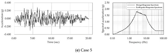 In order to understand the dynamic characteristics of a fluid surface according to the shape of the seismic wave, SIMQKE was used to generate five seismic waves with arbitrary shapes. Since the seismic load randomly created by SIMQKE could not satisfy the design code, the seismic load was modified through a seismic load correction method, and the modified seismic load was compared with the design response spectrum proposed in U.S. NRC RG 1.60. Figure 6 shows the seismic load applied to the fluid–structure interaction analysis (left side) and the comparison of the response spectrum calculated by the modified seismic load and the design response spectrum (right side).