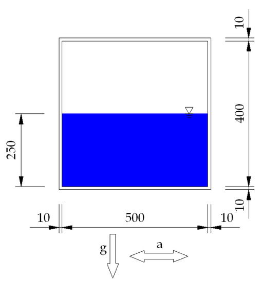 The experiment was performed by varying the ratio of the width of the fluid storage structure to the height of the fluid. The experiment result was used as verification data of Abaqus, the commercially available FE analysis software. If the verification result of the program secured sufficient validity to replace the experiment, the program could be used to analyze various variables. The most important consideration in the FE model applied in this study was fluid. Various elements have been proposed to apply fluid to an FE model, and smoothed-particle hydrodynamics (SPH) elements have recently been used in large deformation problems such as fluid [18,19,20,21]. Therefore, the fluid was modeled using SPH elements as its reliability has been verified in previous work.