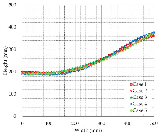 Table 4 shows the time when the maximum sloshing height occurred on the fluid surface and the maximum sloshing height and the minimum sloshing height of the fluid surface, and Figure 8 shows the shape at the time when the maximum sloshing height occurred on the fluid surface. The maximum sloshing height of the fluid surface was measured as 363, 363, 369, 368, and 369 mm, and the minimum height was measured as 180, 183, 183, 184, and 182 mm, depending on the seismic load. The seismic loads that generated the value of 369 mm, which is the largest of the maximum sloshing heights of the fluid surface generated by the five artificial seismic loads, were Case 3 and Case 5, and the seismic loads that generated the smallest sloshing height of 363 mm were Case 1 and Case 2. When comparing the maximum sloshing height generated by the five earthquake loads, it was found that the difference between the largest and the smallest values of the maximum sloshing height was about 1.6%. When comparing the minimum sloshing height generated by the five seismic loads, the difference between the largest and the smallest values of the minimum sloshing height was about 2.2%, confirming that the shape of seismic loads was not affected the maximum and minimum sloshing height. Comparing the shape of the fluid surface generated by different shape seismic loads showed an error of up to 9.244% at all points, meaning that the seismic load shape was not affected by the shape of the fluid surface, or maximum and minimum sloshing height.