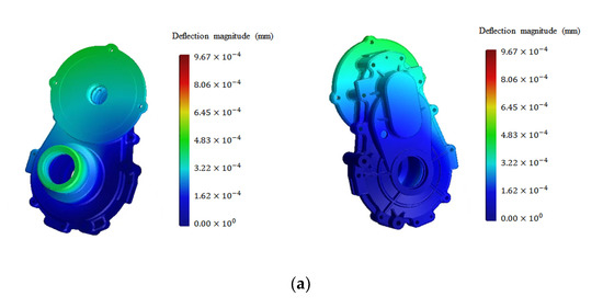 Inoue et al. [8] conducted a study on the optimization of the stiffener to reduce the noise and vibration of the gearbox housing and revealed a correlation between the vibration reduction design and noise reduction design. In addition, to minimize the structure-borne noise of the gearbox housing, the vibration energy of the mode existing in the frequency domain of interest was reduced; this method was most effective when the stiffener was positioned between the bearing and housing fixing. Liang et al. [9] experimentally measured the load at the bearing position to realize the dynamic load acting on the gearbox and verified it by comparing it with the simulation model. The natural frequency of the housing increased by modifying the shape of the housing through a topology optimization technique. Wang et al. [10] optimized the dynamic performance of sawing machine gearbox using topology optimization. The internal components were modeled as point masses to reduce the computational burden. The natural frequencies were used as the output design variables. However, since the noise of electric vehicles has high-frequency characteristics, the resonance avoidance design is not sufficient to account for the high-frequency excitation force [11]. Liu et al. [12] predicted the sound pressure level of a gearbox at a specific field point. The load was modeled as a simulated reaction force at the bearing position. Using a topology optimization technique, the sound pressure level was reduced with objective function of minimizing the housing surface velocity.