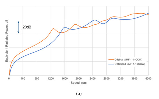 Figure 18 and Figure 19 show the changes in the ERP values before and after performing shape design optimization through topology optimization. Most of the maximum ERP values were reduced under all operating conditions. When the input speed of the gearbox was rated at 2650 rpm, the ERP value decreased by approximately 9.7 dB for the first harmonic and 4.2 dB for the second harmonic in the first-stage gear mesh for CW driving. The ERP value decreased by approximately 2.7 dB for the first harmonic and 5.7 dB for the second harmonic in the first-stage gear mesh for CCW driving.