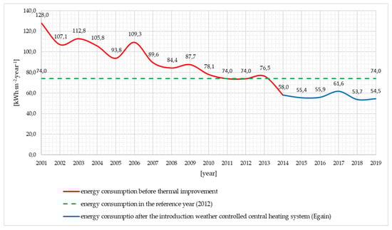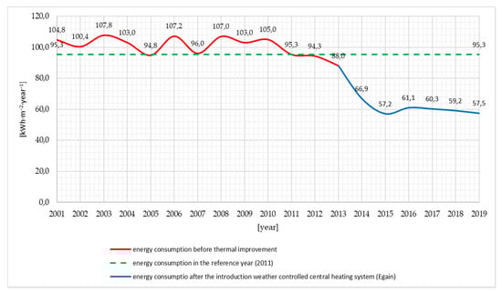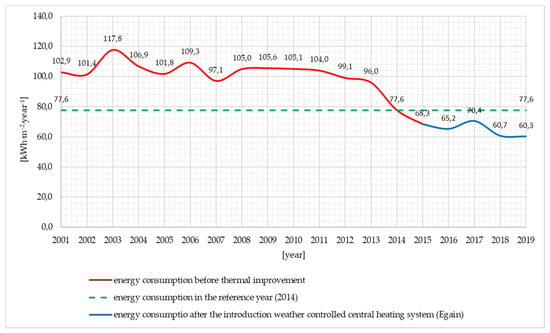 The consumption of thermal energy for the analyzed buildings for the needs of central heating in the years 2001–2019 is shown in Figure 2, Figure 3 and Figure 4. The amount of consumption was expressed using unit indicators of final energy demand, covers the periods before modernization, after thermal improvement (reference year) and the period after the introduction weather controlled central heating system (Egain).