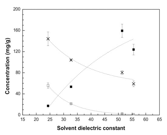 In the case of ethanolic extracts, the concentration of glabridin was higher than glycyrrhizin, while significantly lower concentrations were observed for the rest of the components. Glabridin, an isoflavan, and glycyrrhizin, a triterpene glycoside, are the most abundant and distinctive compounds of licorice roots with several recognized pharmacological properties [43,44]. While glabridin is nearly insoluble in water, the glycosylated sugars present in glycyrrhizin provides some polarity to this compound and thus is better extracted using water. Figure 1 shows the concentration of these compounds in the extracts (mg/g) obtained at 25 °C as a function of the dielectric constant of the solvent used. In the case of water:organic solvent mixtures, the dielectric constant was estimated as the weighted average of the pure solvent dielectric constants. As it can be observed in Figure 1, the extraction of glycyrrhizin increased considerably as the solvent dielectric constant increased, while the opposite effect is observed for the non-polar compound glabridin. Similar results were observed in the case of licorice root UAE extracts obtained at 50 °C.