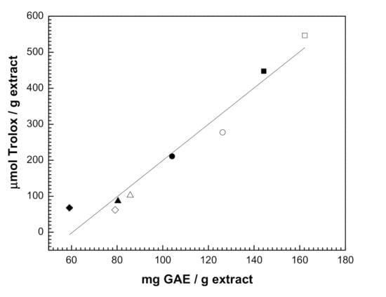 The ability of licorice extracts to scavenge DPPH free radicals was determined according to the method described by Brand-Williams et al. [31]. For the reaction, 25 µL of samples were added to 975 µL of DPPH radical in ethanol (6.1 × 10−5), which was prepared daily. The reaction took place at room temperature, in the dark, until it reached a plateau. Then, the absorbance was measured at 515 nm in a Genesys 10S UV-Vis spectrophotometer (Thermo Fischer scientific, Waltham, MA, USA). The DPPH concentration in the reaction medium was calculated from a calibration curve (linear regression). A control sample, containing the same volume of solvent instead of the extract, was used to measure the maximum DPPH absorbance. Trolox was used as a reference standard, so results were expressed as TEAC values (µmol Trolox/g extract). All analyses were done in triplicate.