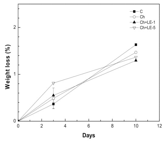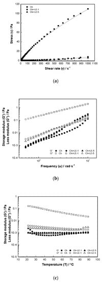 The study of dynamic viscoelastic properties of coating solutions led to obtain information about the molecular entanglement and molecular network formation during drying [59]. The LVR used in this study was the maximum stress value in the flat region of storage modulus () and stress curve. Stress value applied for Ch, Ch + LE-1 and Ch + LE-5 was of 0.1 Pa.