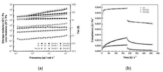 Rheological properties of chitosan and chitosan-licorice edible films: (a) frequency sweep and (b) creep and recovery.