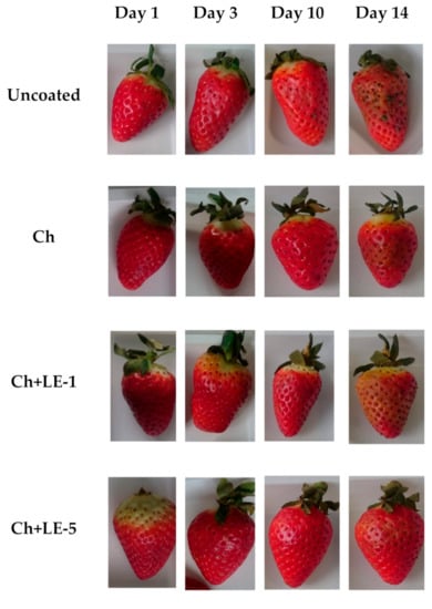 Chitosan has been studied and used for coating fish, meat, fruits and vegetables, to improve the quality and extend the food shelf life [8]. In addition, chitosan can be combined with other functional compounds with antioxidant, antimicrobial or other activities, to enhance the quality and efficacy of the coating [9]. Antioxidants, antimicrobial agents, coloring agents, flavors, nutrients, prebiotics and probiotics are examples of functional compounds that can be incorporated into edible chitosan-based coatings [10]. Particularly, for the case of strawberry (Fragaria × ananassa), some works studied the application of chitosan-based coatings [11,12] but a relatively high moisture permeability was reported [2]. Then, the incorporation of natural bioactive compounds such as nisin, natamycin, pomegranate, grape seed extracts [13], aloe vera gel [14], Thymus capitatus [15] and Mentha spicata essential oils [16] and green tea extract [17], were studied, with the aim of enhancing the performance of the edible coating and the preservation of strawberry. This fruit has been intensively studied, because it is highly consumed [18] and is a relevant source of bioactive compounds such as vitamin C, vitamin E, β-carotene and anthocyanins [19]. Nevertheless, several factors can reduce the fruit quality and limit its commercialization, such as intrinsic physiology, physiological and mechanical lesion, fungal infections and postharvest decay [20,21,22].