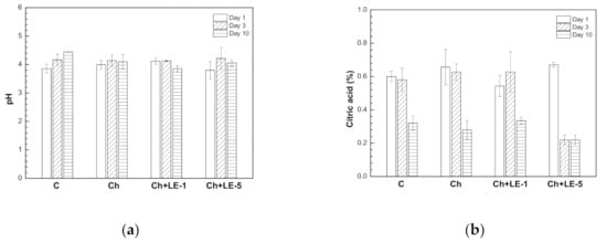 Figure 3a shows the flow curve of different samples: the changes observed in shear stress are a consequence of the addition of licorice root extract to chitosan control, due to the interaction between chitosan and licorice phytochemicals and complexation. All coating solutions exhibited the behavior of non-Newtonian fluid and can be adjusted to the Power Law model (Equation (1)). The model parameters (K and ) are given in Table 4, and high fitting degree (R2 > 0.994) was achieved. The K (consistency coefficient) values decrease significantly and (flux index) values increase with the addition of LE. Chitosan solution presents a consistency coefficient of 0.469 ± 0.015 and flux index of 0.795 ± 0.005. Moreover, the samples Ch + LE-1 and Ch + LE-5 present K values of 3.72·10−4 ± 0.001 and 1.76·10−4 ± 0.001 and values of 1.436 ± 0.018 and 1.503 ± 0.012, respectively. values equal to 1 indicate the Newtonian fluids, lower than 1 indicate shear thinning fluids, while values higher than 1 indicate a shear thickening behavior [54]. Then, the chitosan coating solution presents a shear thinning behavior due to alignment of molecules in the direction of flow, and a decrease of viscosity with the increase of shear rate. Similar results were obtain by Zhang [55] in a coating solution of chitosan/zein with the addition of alpha-tocopherol.