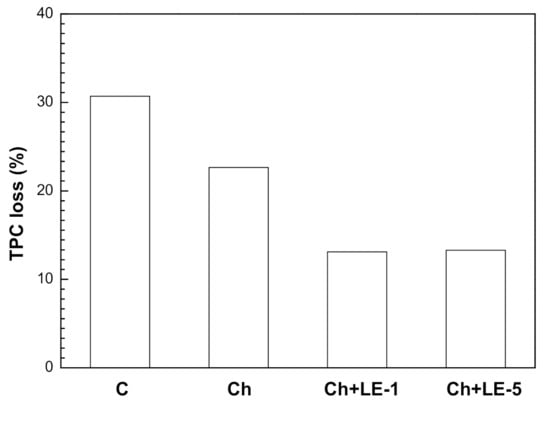 The results given in Table 6 indicate that, on day 10 and for all cases (uncoated and coated fruit), the TPC values were lower after the cold storage. But, the type of coating had a significant effect on the observed TPC decrease, as is depicted in Figure 9, and the control samples (uncoated fruit) presented the highest TPC loss percentage (30.93 mg GAE/g), followed by chitosan coating (22.65 mg GAE/g), chitosan + 1% LE (13.1 mg GAE/g) and chitosan + 5% LE (13.3 mg GAE/g). Then, LE extract contributed significantly to preserve the phenolic compounds of samples.