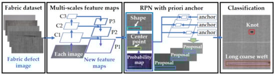Figure 1 shows the fabric defect detection process of the PRAN-Net based on the Faster R-CNN proposed in this paper. First, the FPN [] is used to extract feature maps at different scales from the fabric images. Then, priori anchors are adaptively generated in each scale feature map as the defect proposals. Finally, a classification network is established to classify and refine the position of defects in fabric images by the defect proposals.