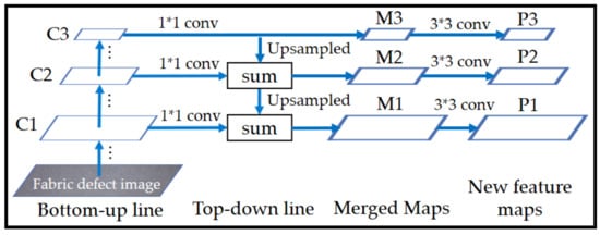 As shown in Figure 2, we use the typical deep residual network ResNet-101-FPN [] as the backbone to extract features of fabric defects. The whole network is divided into bottom-upline and top-down line, which consists of several convolutional layers and upsampling layers. These two lines are laterally connected with 1 × 1 convolutional layers, which are used to reduce the channel dimensions. For the bottom-upline, the classical FPN obtain five scales feature maps. To reserve enough information of tiny defects while getting rid of redundant information and increasing efficiency, we only retain three feature maps with strides of {4, 8, 32} defined as {C1, C2, C3}, respectively. For the top-down line, the high-level feature map is fused with the low-level feature map. M3 is the third scale feature map in the merged maps obtained by the 1 × 1 convolution of C3. The upsampled M3 and the 1 × 1 convolution result of C3 are summed to get M2. The same operation is done to M2 and C2 to get M1. To reduce the aliasing effect of upsampling, {M1, M2, M3} are convoluted by a 3 × 3 convolution kernel to get three new feature maps {P1, P2, P3}. The top-down line operation enables to reserve more detailed information of defects by interlayer fusion, which is especially beneficial to detect tiny defects.
