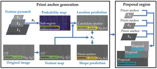 where is the probability of the existing defect in the image , and is the probability of the specific shape defects. Based on formula (1), the priori anchors are generated adaptively in different scale feature maps in two steps: predicting coordinates of the defect center and predicting the shape of the defect guided by the ground truth (GT) box of defect as shown in Figure 3.