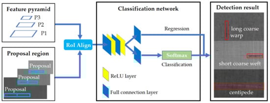 The structure of the classification network is shown in Figure 4. Defect proposals and their corresponding feature maps are resized by a RoI Align layer [] to the fixed size. Then, the features are fed into a sequence of full-connection layers and are finally branched to classification and bounding box regression. The classification branch outputs the prediction of defect category, and the regression branch outputs the prediction of defect position after the secondary location.