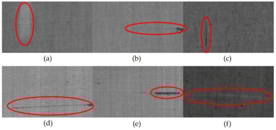 Samples of the defects in the plain fabric images. (a) oil stain, (b) long coarse weft, (c) long coarse warp, (d) long coarse weft, (e) short coarse weft, and (f) mispick.