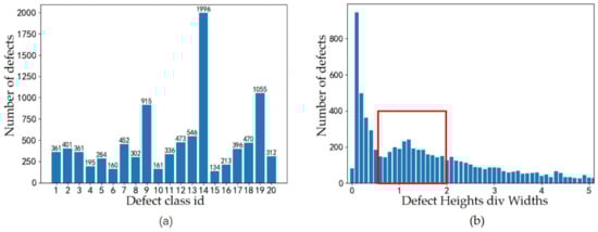 The denim dataset has 6913 images and overall 9523 defects labeled in PASCAL VOC [] format. The image size is 2446 × 1000 pixels. There are 20 categories of defects. The number of each category defect is shown in Table 2 and Figure 6a. Most of the defects are tiny, and there areas are less than 1% of the entire image. The aspect ratios distribution of defects is shown in Figure 6b. The red bounding box corresponds to the number of defects with moderate aspect ratios. The extreme aspect ratio defects from 0 to 0.5 and 2 to 5 are accounted for 47.7% of total defects.