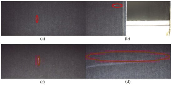 Figure 7 shows some defects of the denim dataset. Defects such as knot and coarse warp in images are extremely small, the shapes of three wire and flower jump defects are extreme aspect ratios outside the red box in Figure 6b.
