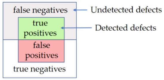 The detection results of each category defect are divided into true positive (TP), false positive (FP), true negative (TN) and false negative (FN) as shown in Figure 9. The upper of the outer rectangle is true defects including TP and FN, the lower of the outer rectangle is non-defects including FP and TN. The inner rectangle is the detected defects, which includes TP and FP detected by mistake.