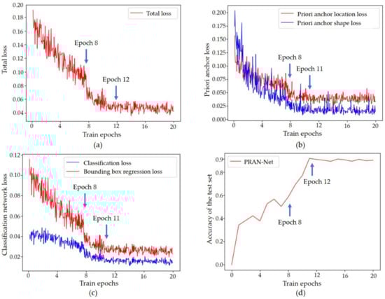 The training loss value curves and accuracy curve of PRAN-Net for the denim dataset. (a) the total loss value curve, (b) the priori anchor loss value curve, (c) the classification network loss value curve and (d) the accuracy curve of the test set.