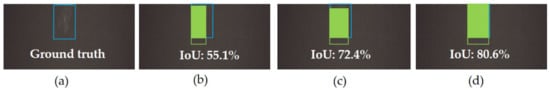 IoU of the detected region with the matched GT is used to evaluate detection performance as shown in Figure 8. The IoU threshold is set to 0.5 to distinguish whether the detected bounding box is a defect.