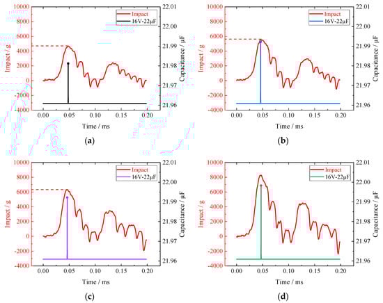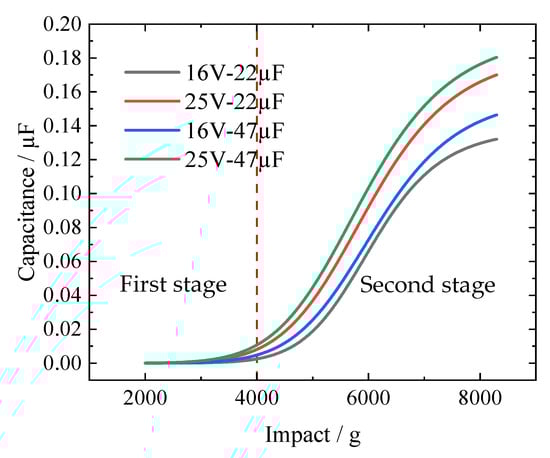 - The facing area deformation is the dominant factor in the transient change of the capacity value. A mechanical model based on the facing area is established to calculate the capacity change. The numerical calculation results are consistent with the experimental results, and the relationship between the impact and capacity changes can be described semi-quantitatively.