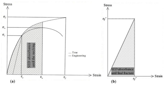 The grey area in Figure 5b indicating the SED absorption of the equivalent brittle material until fracture (SEDf) can be written as: