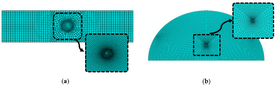 Examples of mesh patterns. (a) cracked rectangular specimens (DM); (b) cracked SCB specimens (BC material).