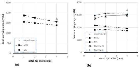Figure 7a shows the variations of the load-carrying capacity (LCC) of the BC UNBD specimens versus the notch tip radius for MTS and MS criteria as well as for the experiments. Analogously, Figure 7b also represents the results of MTS, MS, EMC-MTS and EMC-MS criteria for the DM UNBD specimens together with those of the fracture tests. Moreover, Table 3 presents the discrepancies (%) between the theoretical and experimental results. Negative values mean that the predictions underestimate the experimental critical loads, whereas positive values imply overestimations of the load-carrying capacity.