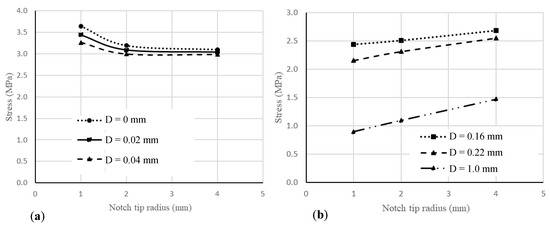 Variation of linear elastic tangential stress versus the notch tip radius at different distances from the notch tip and for an arbitrary load of 100 N. (a) Distances (D) of interest for DM (rc = 0.04 mm); (b) Distances of interest (D) for BC material (rc = 0.17 mm).