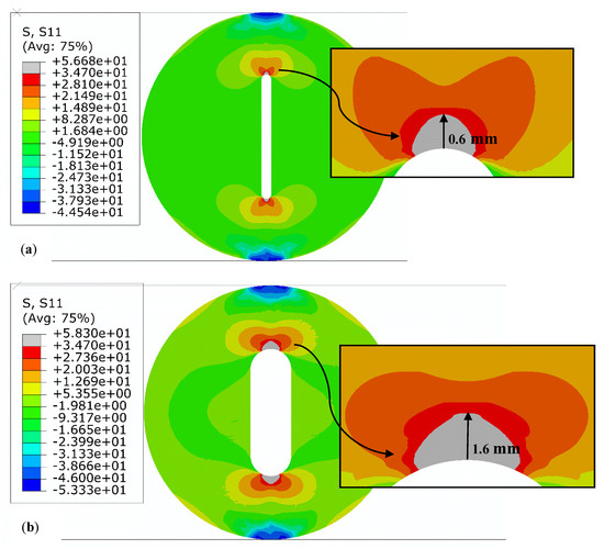 Tangential stress distributions (MPa) around a U-notch together with the effective plastic zone size (EPZS). (a) Notch tip radius = 1 mm; (b) notch tip radius = 4 mm.