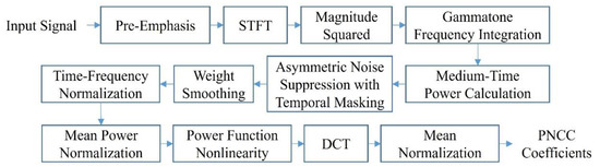 - Kim, C.; Stern, R.M. Power-Normalized Cepstral Coefficients (PNCC) for Robust Speech Recognition. IEEE/ACM Trans. Audio Speech Lang. Process. 2016, 24, 1315–1329. [Google Scholar] [CrossRef]