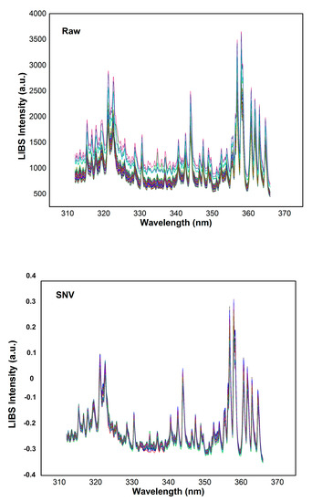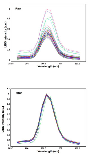 Figure 6 shows raw LIBS spectra for all the samples compared with detailed SNV and SNV + SG spectra in a specific spectral region (310–365 nm) and illustrates how the filter directly affects the transitions and the background attenuating fluctuations. As a verification criterion to estimate the noise reduction achieved by the applied filters, three spectral configurations were considered, i.e., raw without any treatment, SNV normalized, and SNV-SG corrected of the transition of Fe II (266.663 nm) (Figure 7). This transition was chosen because it was apparently not inferring interferences, and the concentration of Fe in the sample was very high and practically constant. To ensure an identical analytical condition for the three configurations, a baseline correction and normalization was performed to guarantee that the set of spectra remained within a minimum of zero and a maximum of one in intensity. This process did not affect the fluctuation among spectra (Figure 7), as it was applied to the set of spectra as a whole and not individually to each spectrum. A sum of pixel intensities was performed, which resulted in a transition intensity/area value (Riemann sum) for each spectrum. Then, the mean of these intensities and the standard deviation were calculated. The percentage value of the standard deviation related to the mean value was 31.5% for the raw spectra set, 3.7% for the SNV set, and 1.9% for the SNV-SG set. These results show that the process as a whole was able to reduce global spectral fluctuations and probably was a collaborative factor in improving the multivariate model.
