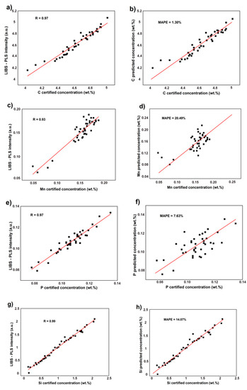 The calibration and the validation curves of the elements C, Mn, P, Si, and Ti constructed by applying PLS to the areas of the corresponding elemental lines versus the certified concentrations are shown in Figure 8. The R and the RMSE values achieved for the calibration curves and MAPE and LOD for the validation curves using univariate and multivariate models (Table 1) indicated a significant improvement achieved by PLS and PLS + SG data treatment. In particular, the R (above 0.93) and the RMSE (below 0.07, with the exception of C) values of the calibration curves constructed using the PLS approach were very satisfactory for all elements, and especially for Si and Ti. Additionally, the MAPE percentage values achieved in the validation by PLS (below 15% for all elements except Mn) were also satisfactory.